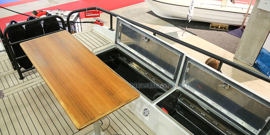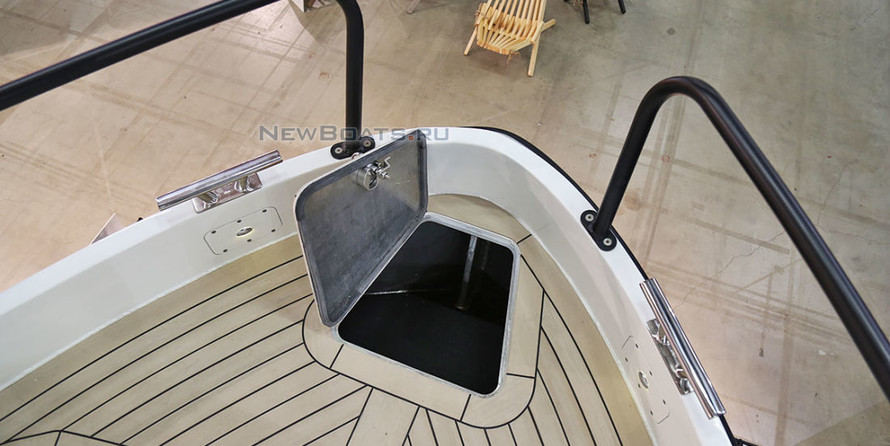The asymmetrical design of the deck provides enhanced comfort of the interior. Below deck can accommodate 5 people. The front of the engine compartment, large cargo space aft in the cruising flight can accommodate 12 passengers . Everything from jars and tables can be rearranged depending on specific tasks, for example, to ensure diving operations, water sports activities, fishing, etc. In the operating mode use different additional equipment for loading, unloading and transportation of goods. The aft deck with a length of 3.4 m (+bathing platform) allows you to carry long items.