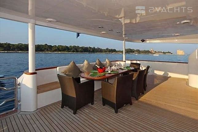 The motor yacht can accommodate 10 guests in 5 cabins. The yacht was designed by Luiz de Basto.