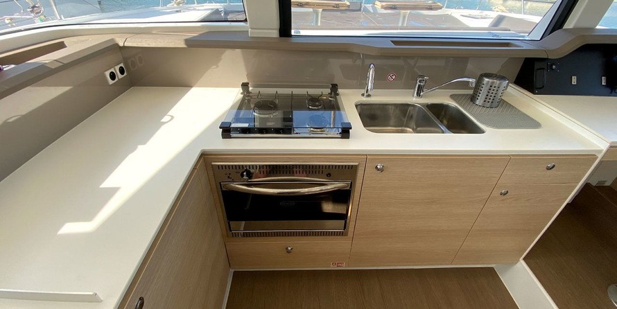 Boat equipment features classical mainsail, electric winches, solar panels, radar, bimini and outside gps plotter. It also boasts a heating, an audio system, outside speakers, flybridge and inside speakers. The fully-equipped galley includes a freezer, coffee machine, oven, cooker and sink.