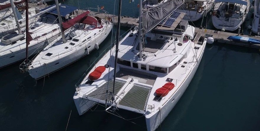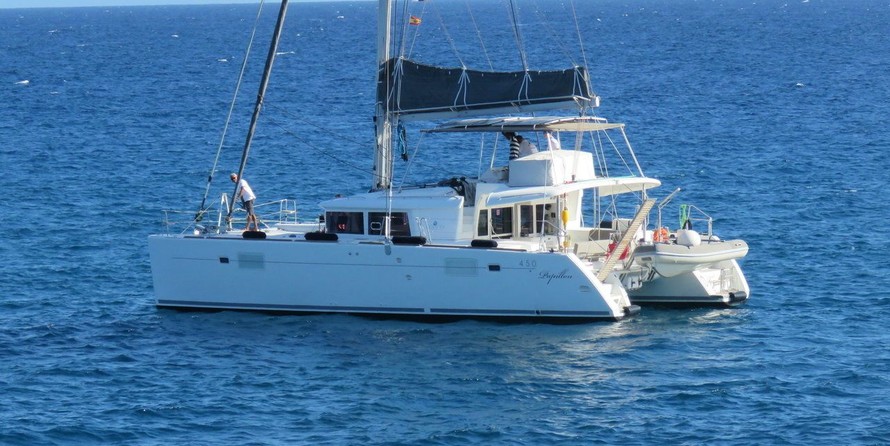 6-cabin catamaran Lagoon 450 F - Papillon was built in 2014, and it is docked in Marina del Sur, Spain.