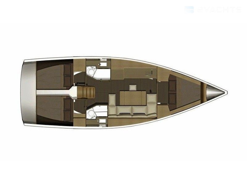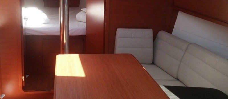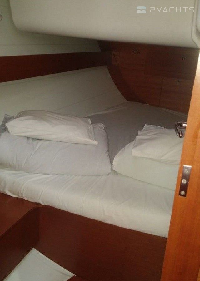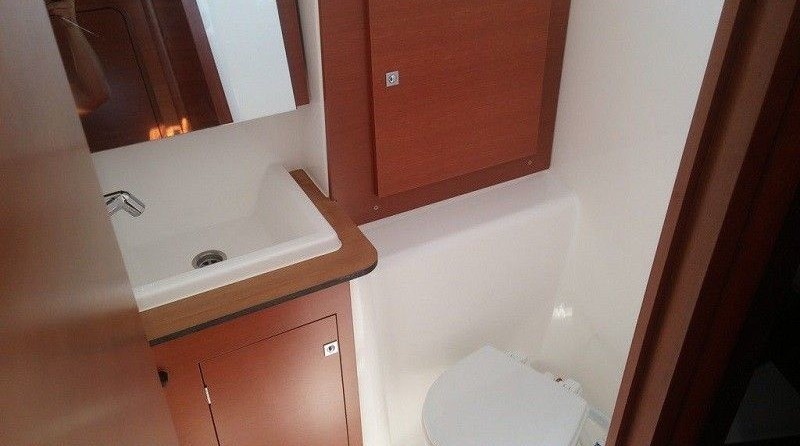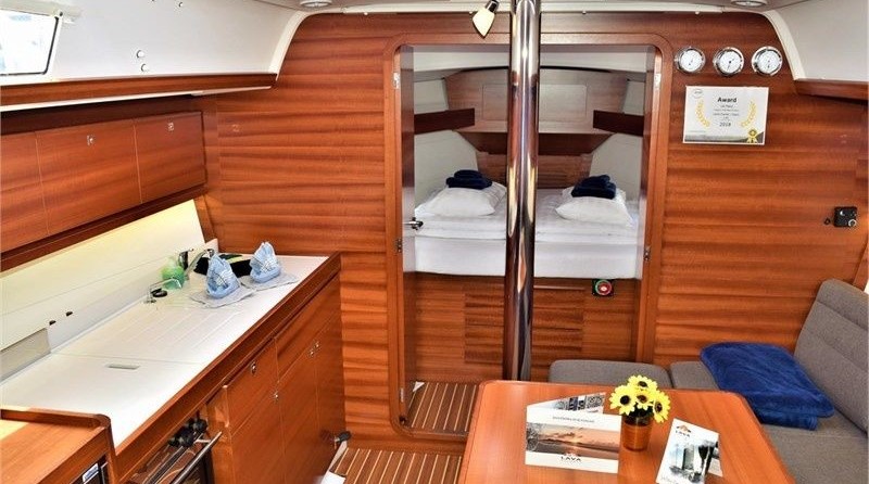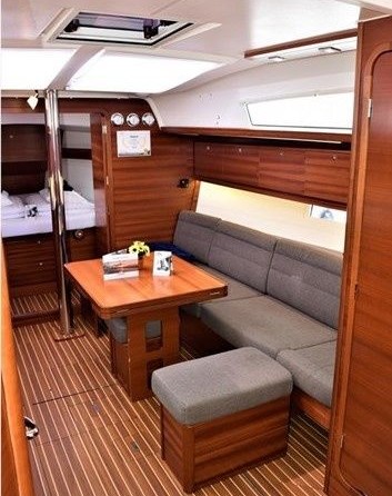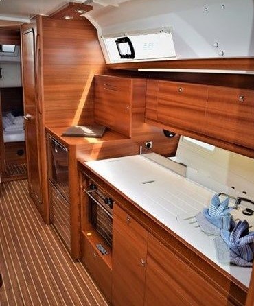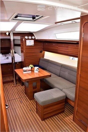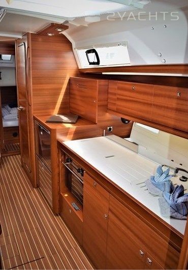 Boat equipment features classical mainsail, bimini and bow thruster. It also boasts a heating, an audio system, outside speakers and inside speakers. The fully-equipped galley includes an oven, cooker, sink and kitchen utensils.