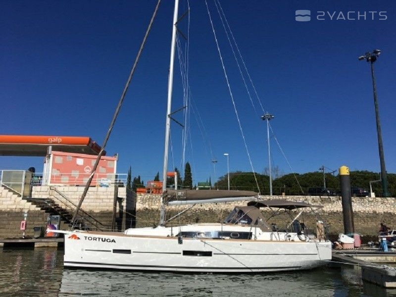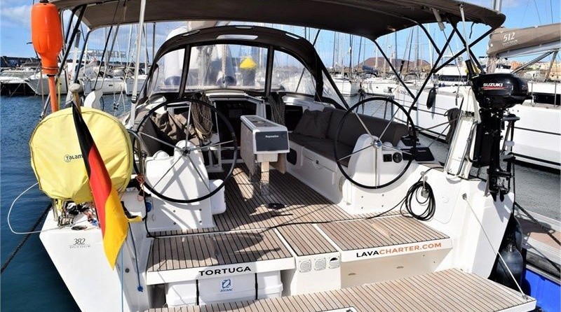 3-cabin sailing yacht Dufour 382 - Tortuga was built in 2017, and it is docked in Marina Lanzarote, Spain.