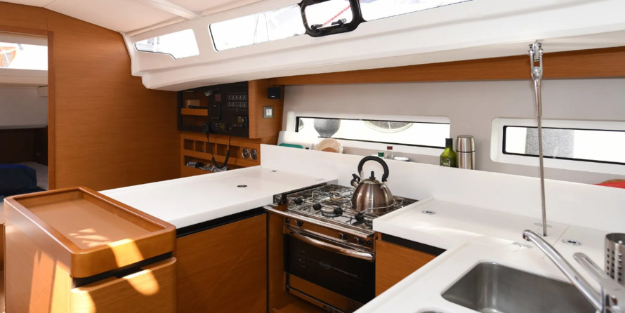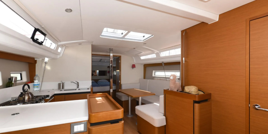 Boat equipment features classical mainsail, bimini and bow thruster. It also boasts an an audio system and inside speakers. The fully-equipped galley includes an oven, cooker and kitchen utensils.