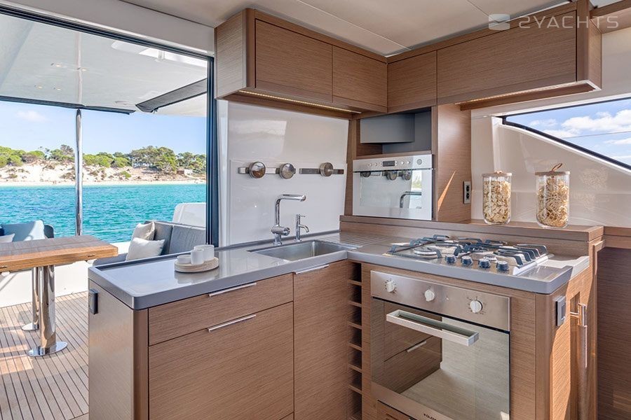 Boat equipment features classical mainsail, bimini and outside gps plotter. It also boasts an an audio system, outside speakers, flybridge and inside speakers. The fully-equipped galley includes an oven, cooker, sink and kitchen utensils.