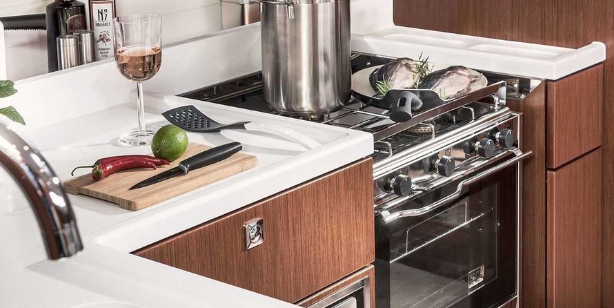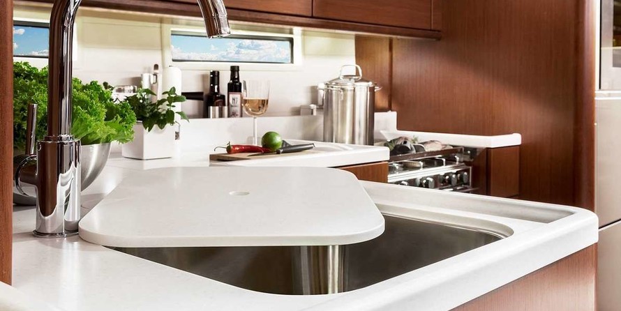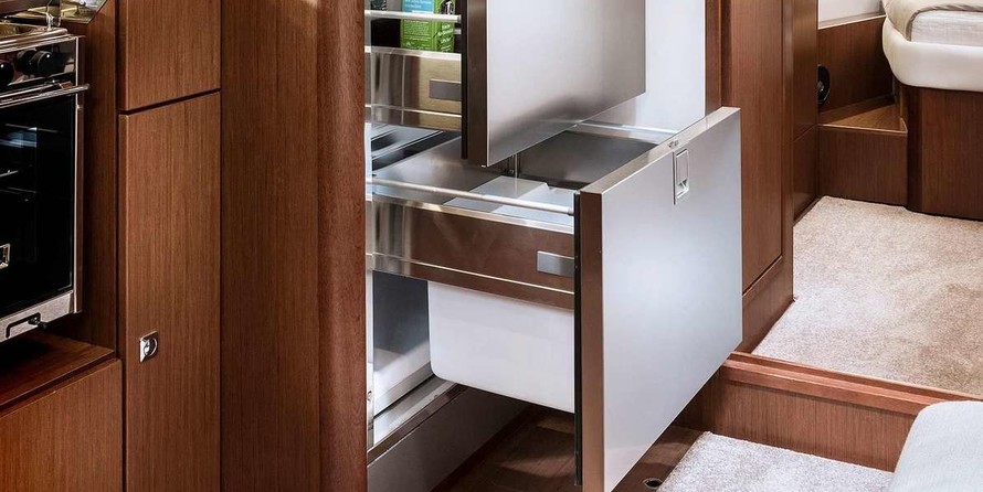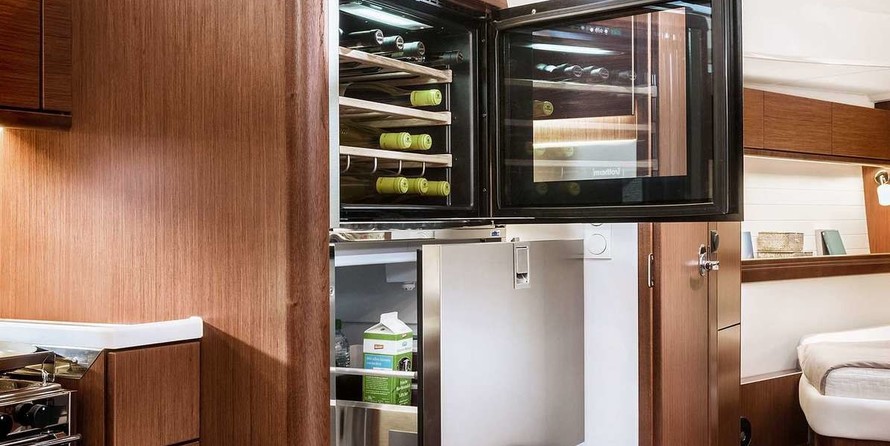 Boat equipment features Rolling mainsail, Solar panels, Bimini and Bow thruster. It also boasts an Audio system, Outside speakers and Inside speakers. The fully-equipped galley includes Freezer, Oven, Cooker, Sink and Kitchen utensils.