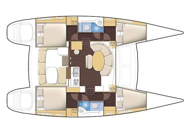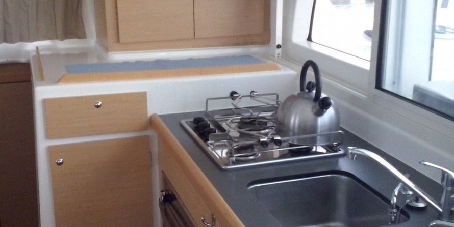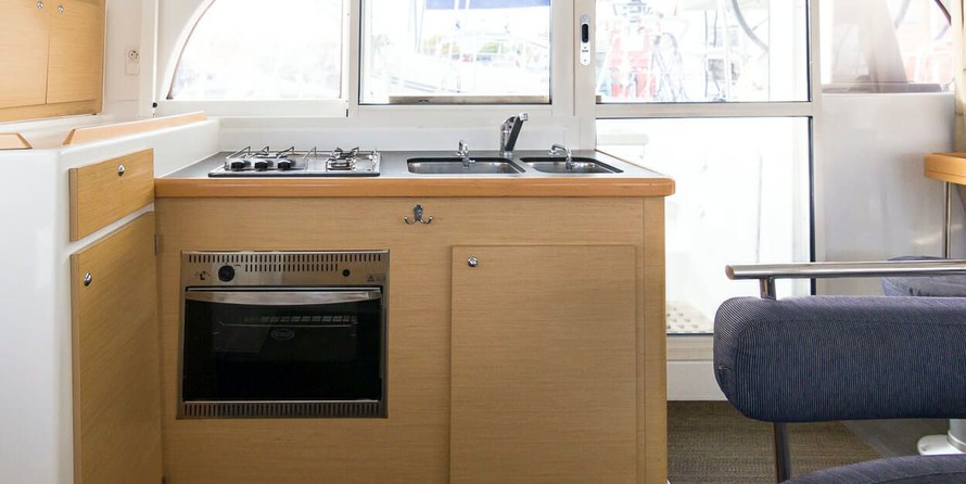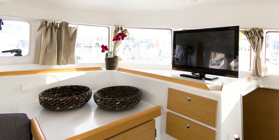 Boat equipment features classical mainsail, solar panels, radar, salon gps plotter, bimini and outside gps plotter. It also boasts a flat screen tv, an audio system, dvd player, outside speakers and inside speakers. The fully-equipped galley includes a freezer, coffee machine, oven, cooker and sink.