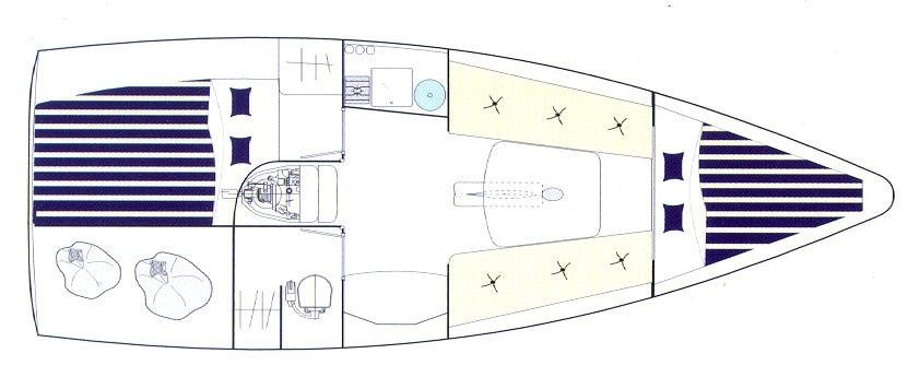 Boat equipment features classical mainsail, bimini and outside gps plotter. It also boasts an an audio system and outside speakers. The fully-equipped galley includes a cooker and kitchen utensils.