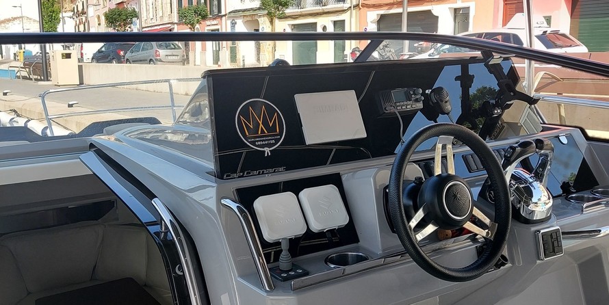 The motorboat Menorcamar 10 is equipped with a 2x300hp engine.