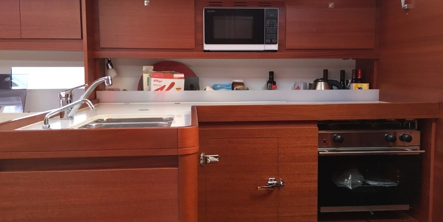 Boat equipment features classical mainsail, bimini and bow thruster. It also boasts an an audio system, outside speakers, stand up paddle and inside speakers. The fully-equipped galley includes a microwave, oven, cooker, sink and kitchen utensils.
