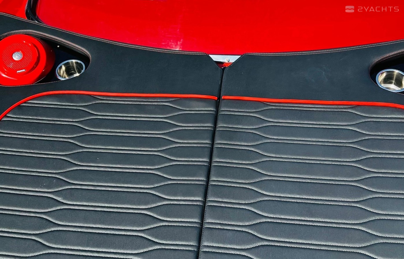 The sun decks on either side of the boat have also been redesigned, and made more comfortable, also thanks to the added cup holders and integrated loudspeakers. The table used for the large C-shaped sofa in the cockpit can be lowered thanks to an hydraulic servomechanism, to transform the seating area into another sun deck which is protected from the edges to make it extra safe, especially for children.